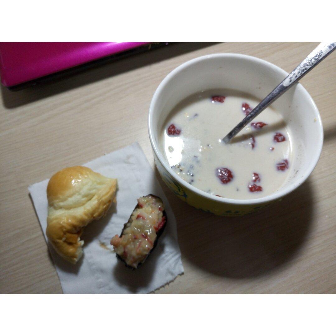 艰苦朴素晨跑餐,婷婷舍友给的章鱼🐙寿司🍣,雯姬舍友分的红豆牛角包,...
