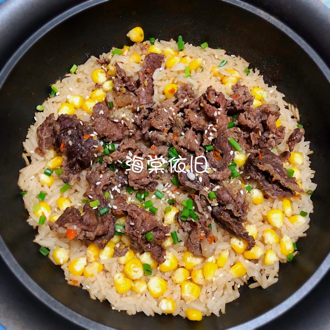 牛肉调味好用压力锅蒸熟,将牛肉汁搭配甜玉米粒煮饭,煲好饭以后放上蒸好的牛肉,撒上葱花,增加颜值,米饭甘香入味,牛肉软糯可...
