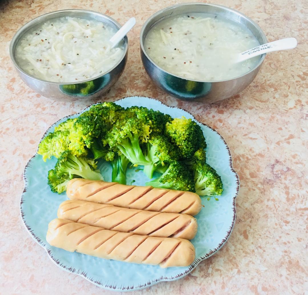 清淡饮食,藜麦鸡丝粥+水煮西兰花+芝士烤肠