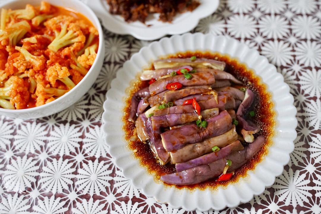 拌茄子,西红柿烩花菜,姜丝煸鸭架