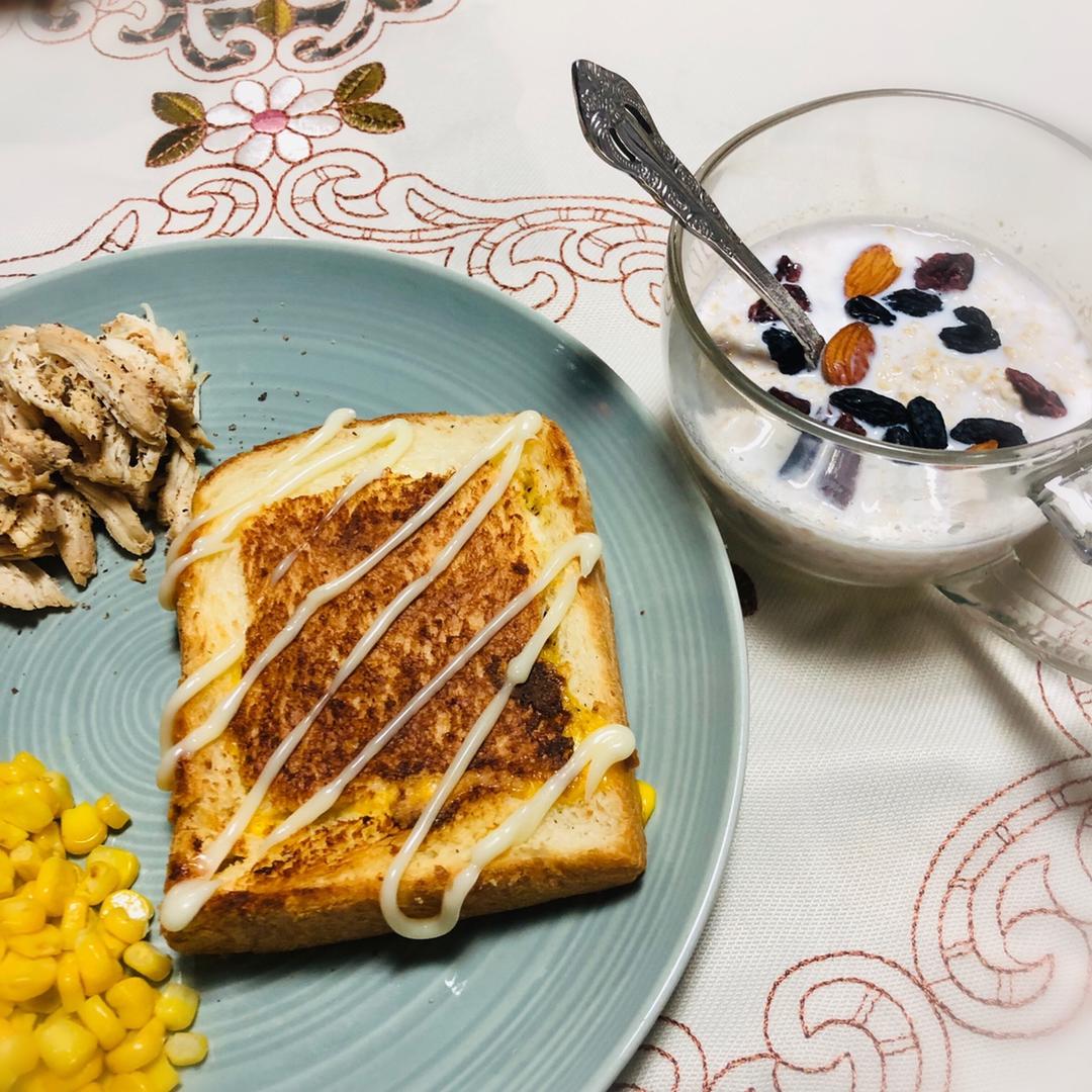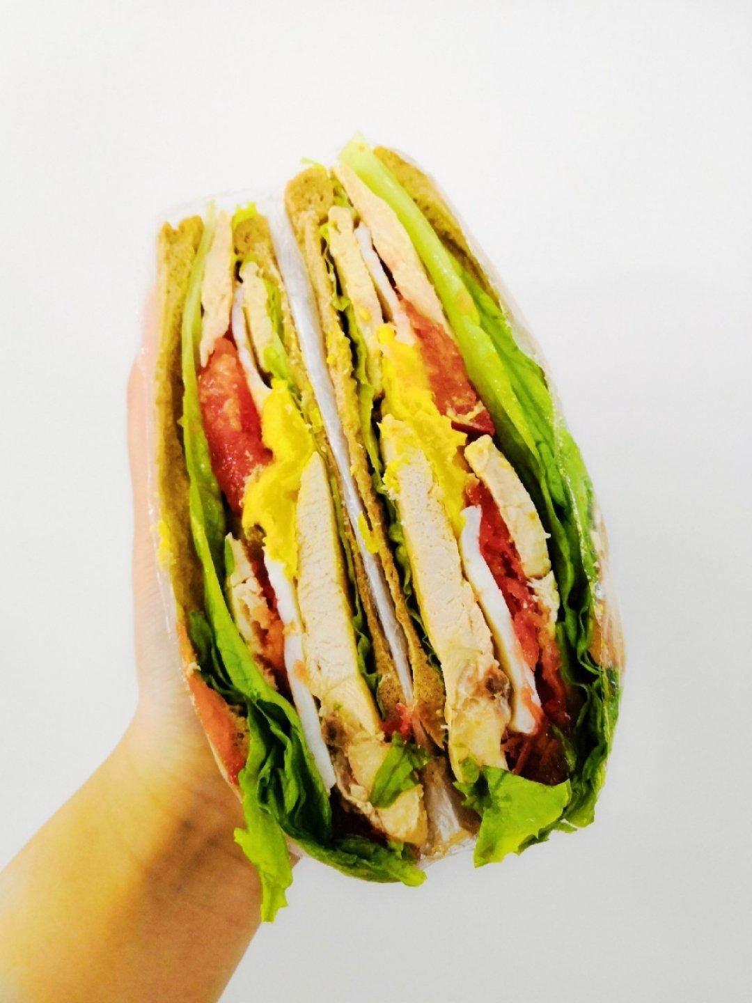 两片全麦面包🍞+两片生菜+两片番茄🍅+鸡胸肉若干+有灵魂的煎蛋🍳