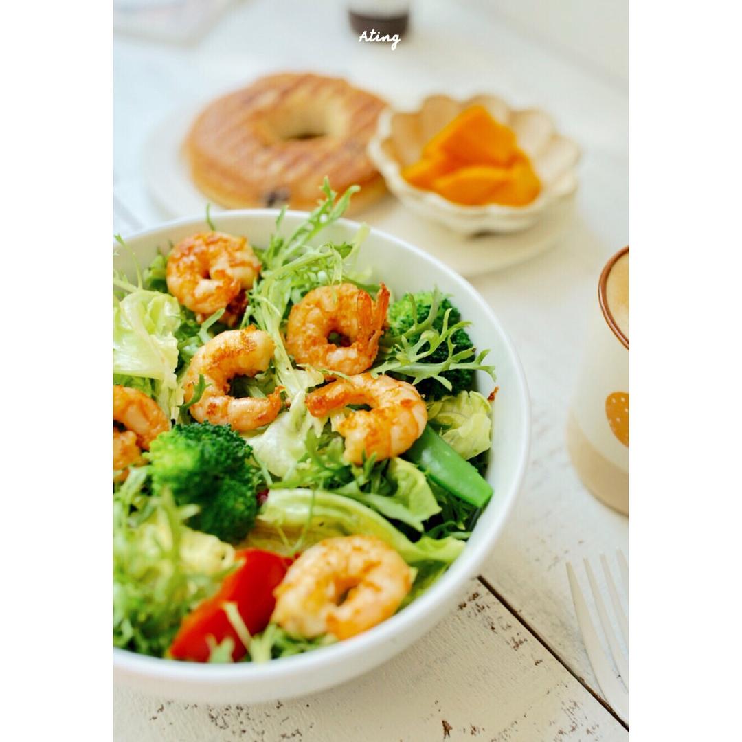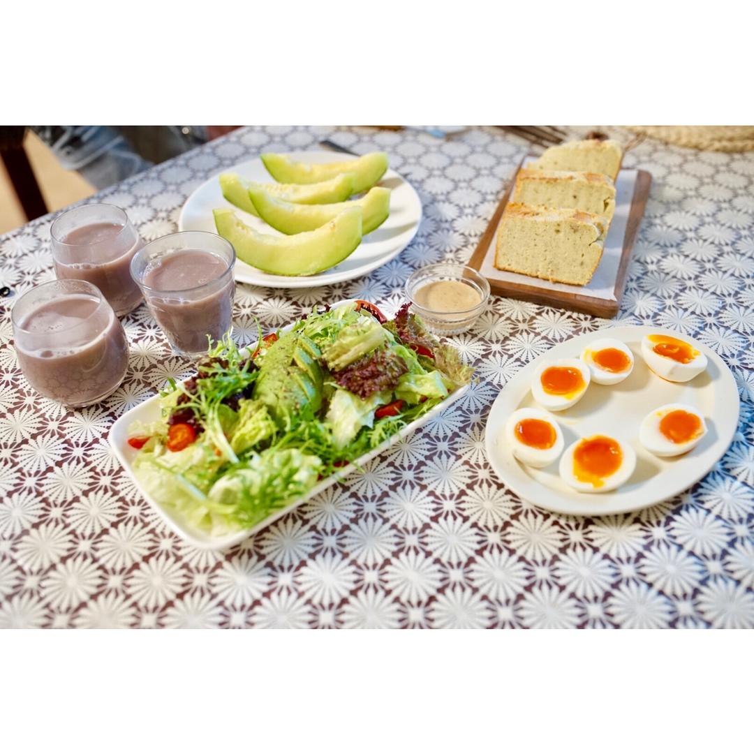 沙拉🥗,燕麦红豆浆,蕉多多戚风蛋糕,蜜瓜🍈,溏心蛋