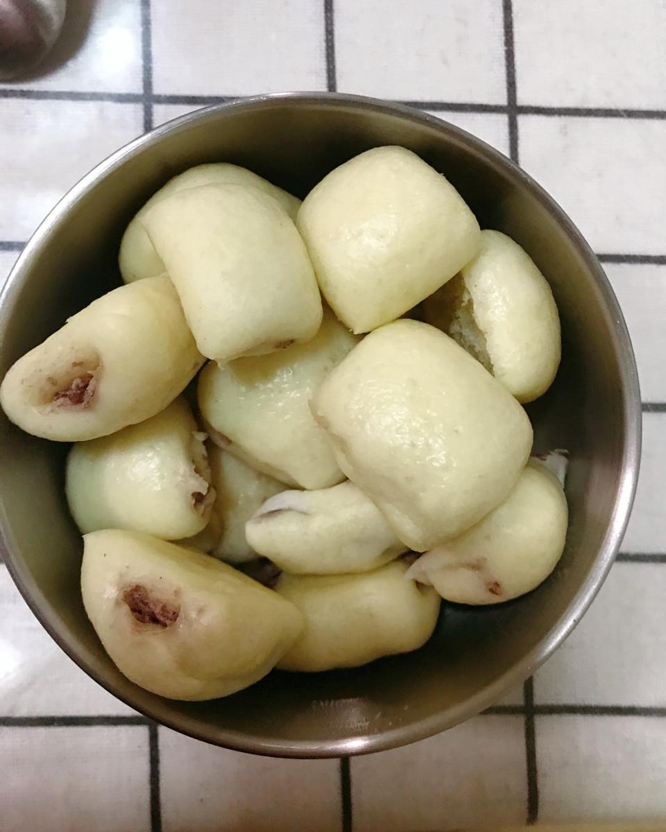 早上宝宝的红豆粥没吃完,我就给打成泥炒了水,包起来了,因为宝宝吃也没给放糖炒,所以豆沙馅很干。宝宝爱吃就好啦😄