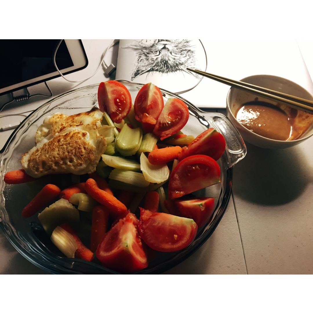 蒸芹菜胡萝卜,两只生番茄,两只煎蛋~周六晚上好~