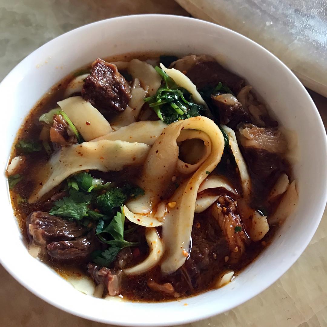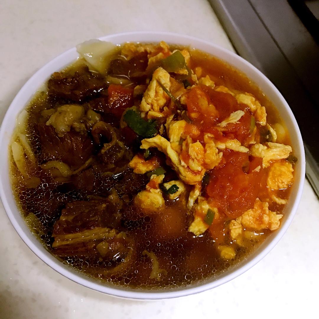 丈母娘疼女婿啊→两掺的刀削面,牛肉➕番茄炒蛋。