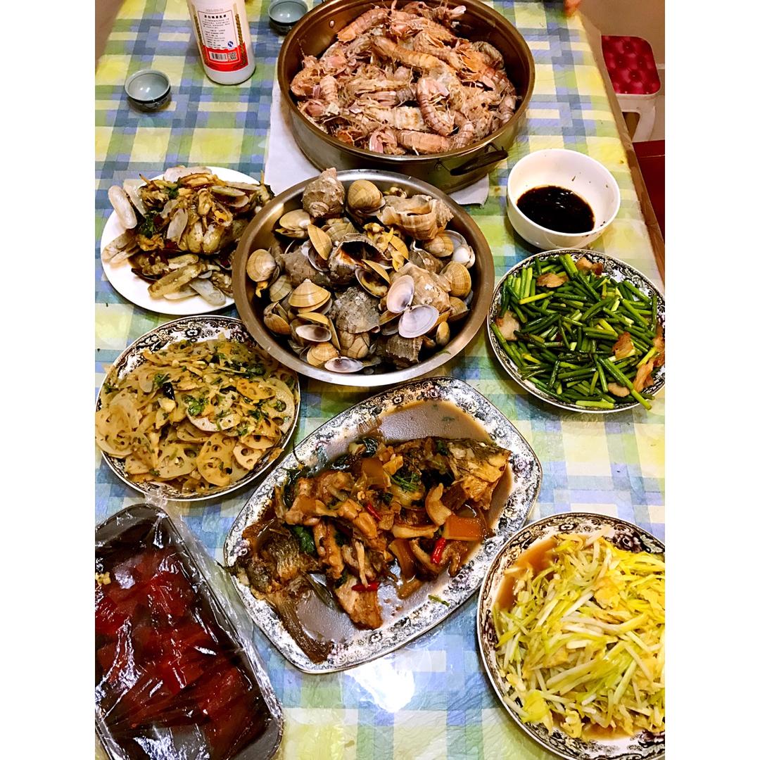 辣炒蛏子➕凉拌藕片➕白灼虾➕红烧鱼➕蒜蓉花蛤➕蒜黄炒鸡蛋➕肉丝炒蒜薹