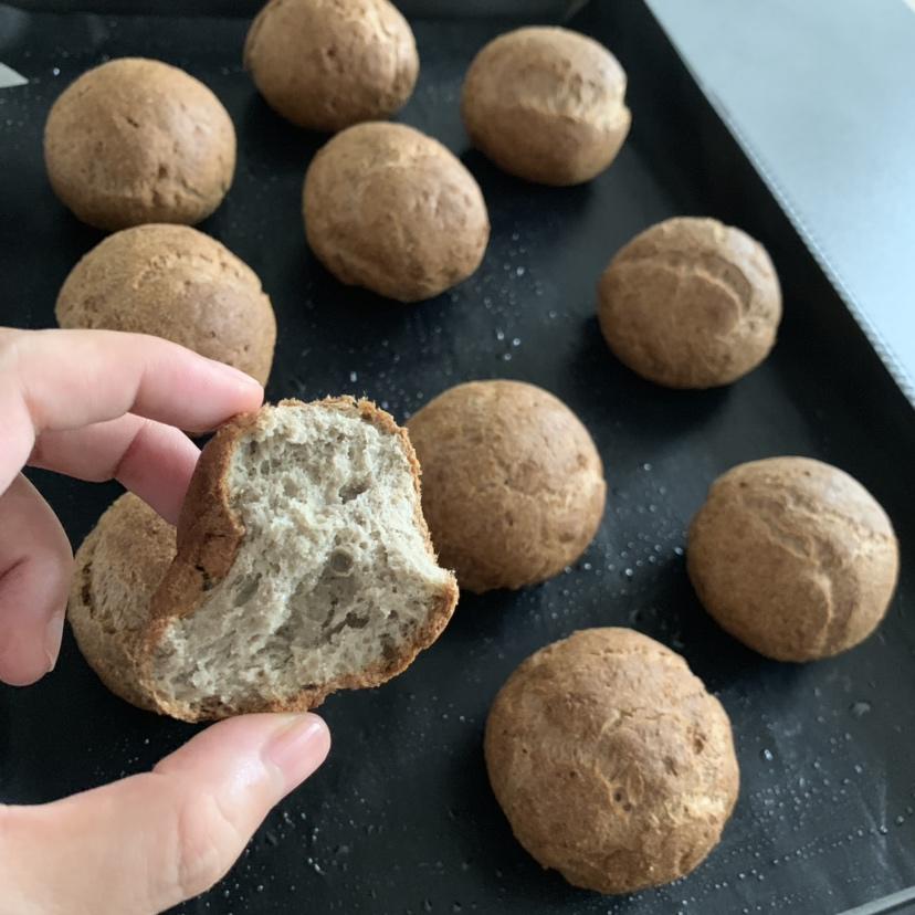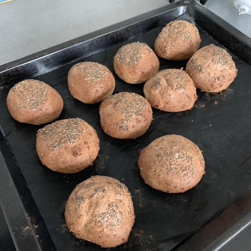 烤制前沾了一层奇亚籽,膨胀够大,回缩轻微;虽然没有真正小面包的脆表皮,但松软口感也不错,这是目前为止我试过的最好吃的小面...