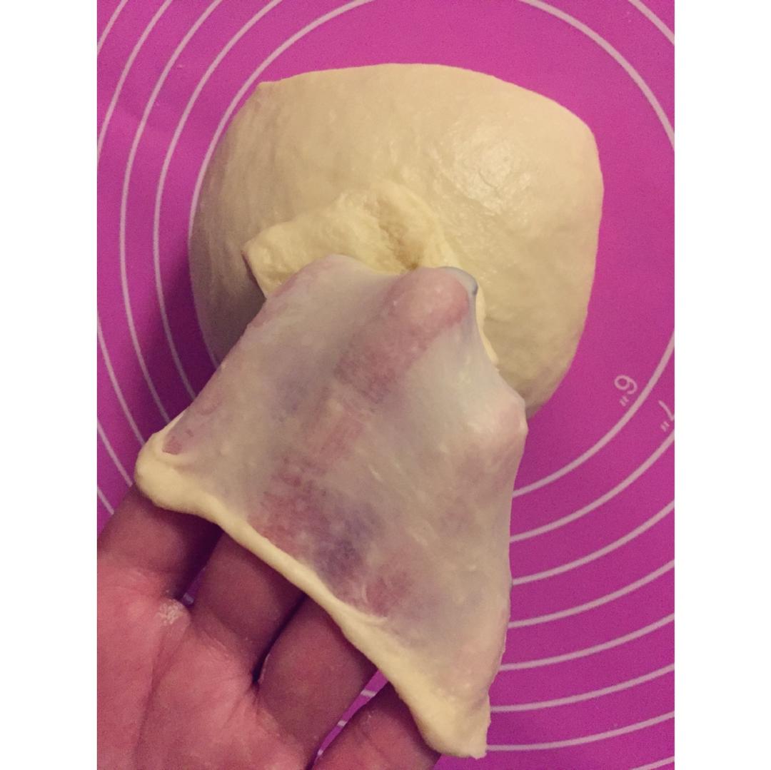 回家晚了,刚刚花了一个小时手揉,其中半个小时面对的都是一团巨粘无比的面团。一点干粉也没加,耐着性子,出膜了,其实根本没花...