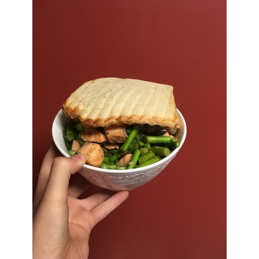 三文鱼炒芦笋 三文鱼买错了 买成有皮的了 然后许大厨上演了手撕鱼皮🙈
