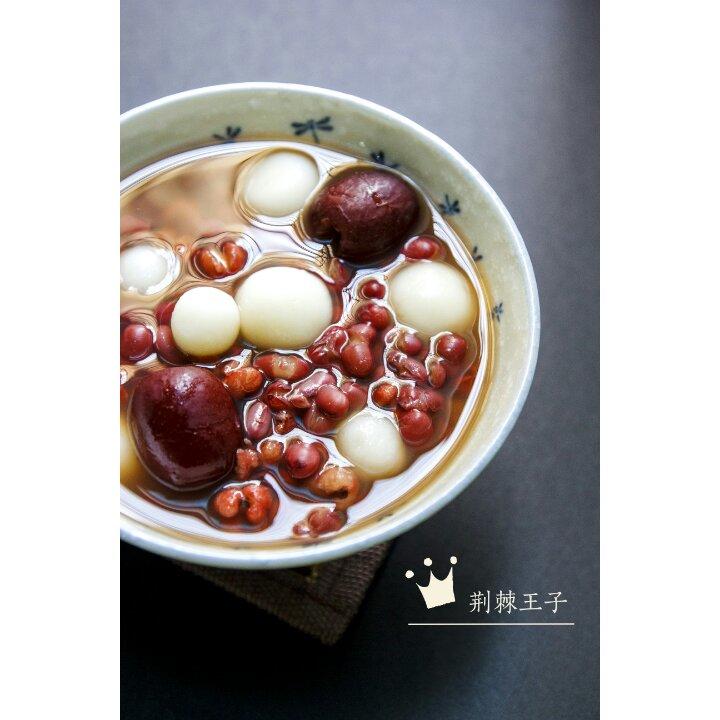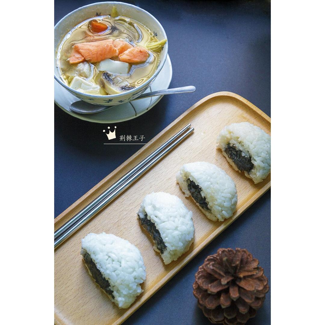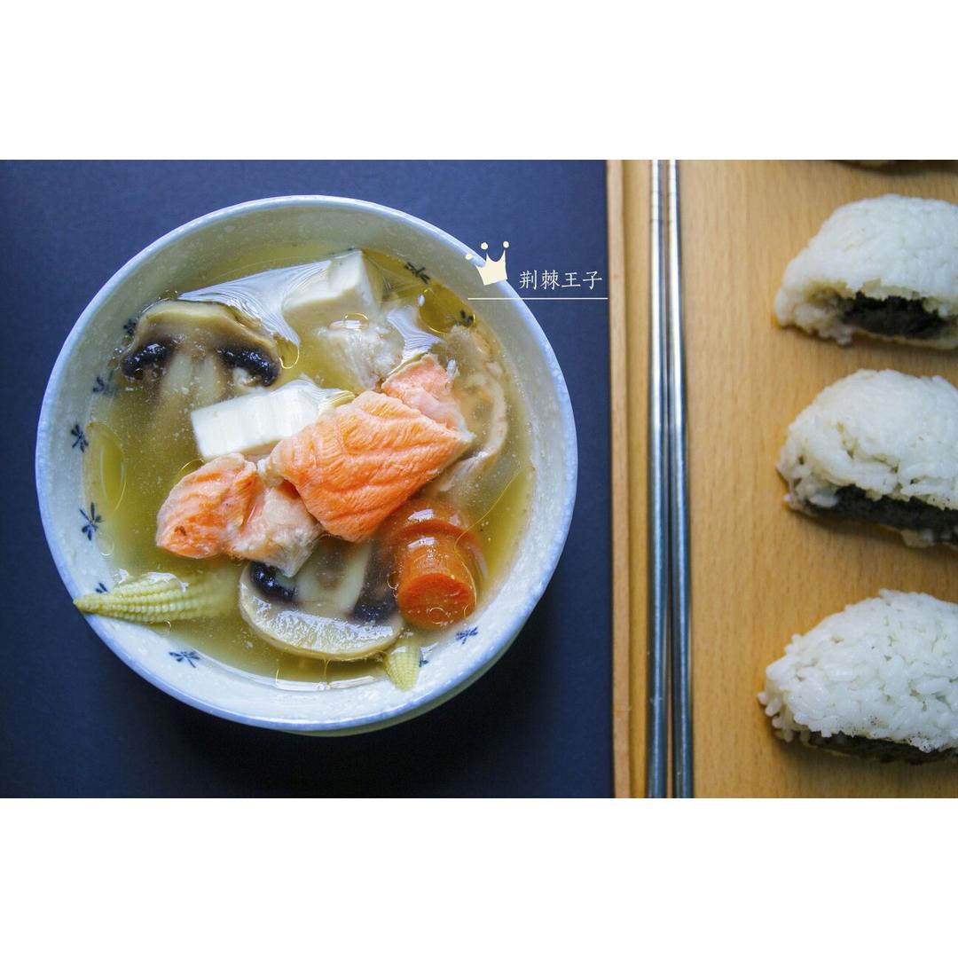 三文鱼味噌汤,配糯米芝麻馅糍团。