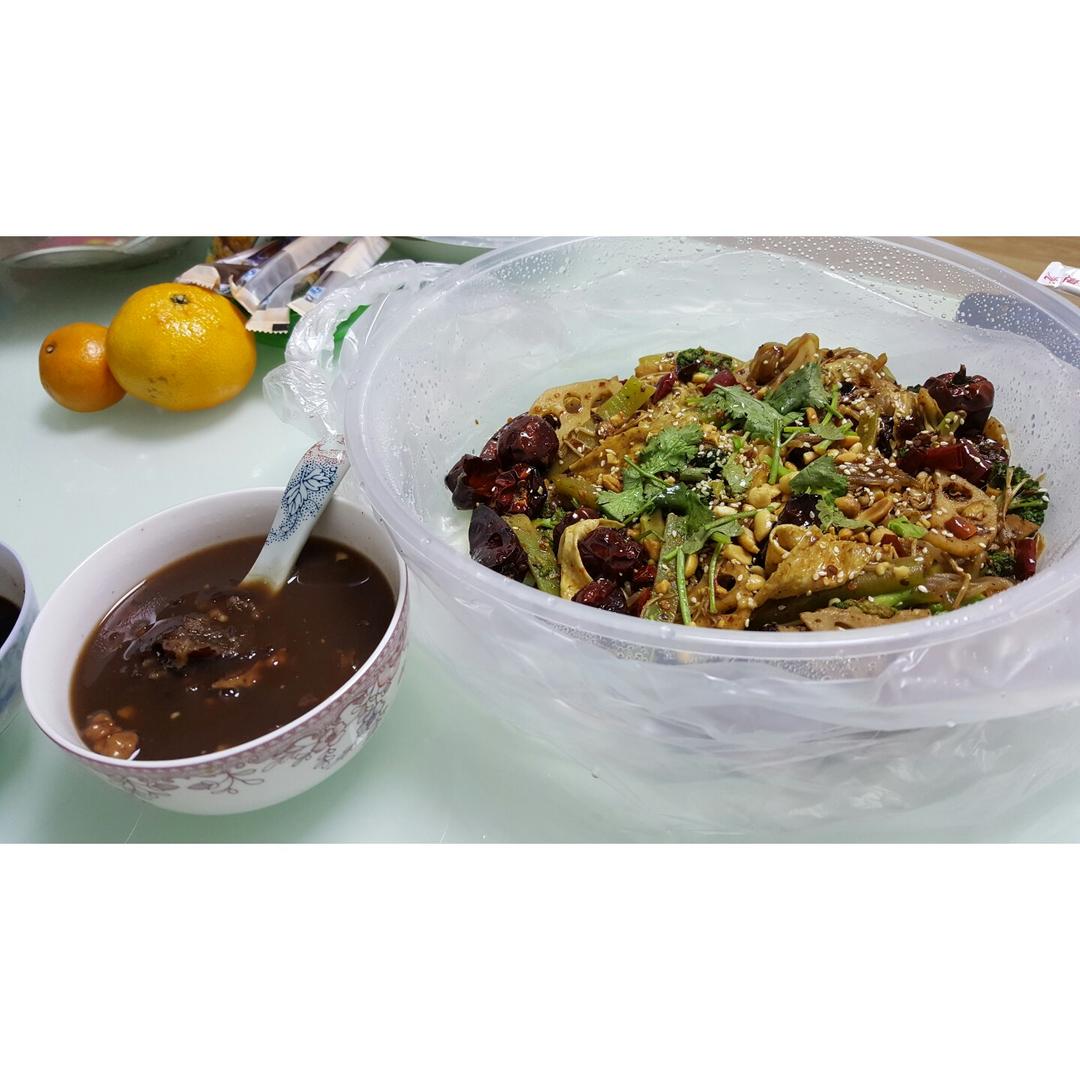 有了炖锅真方便回家直接喝粥,外卖的麻辣香锅,请叫我大胃王😂今天粥里放了黑豆,黑米,核桃,红...