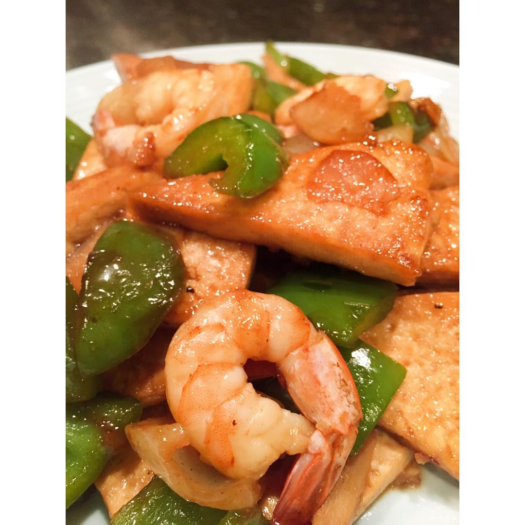 家常大虾烧豆腐。煎豆腐可真是个细活儿!幸好我有大大的万能煎锅,两盒豆腐一锅就煎好了。配菜是洋葱青椒和大虾,满满的一大盘哦...