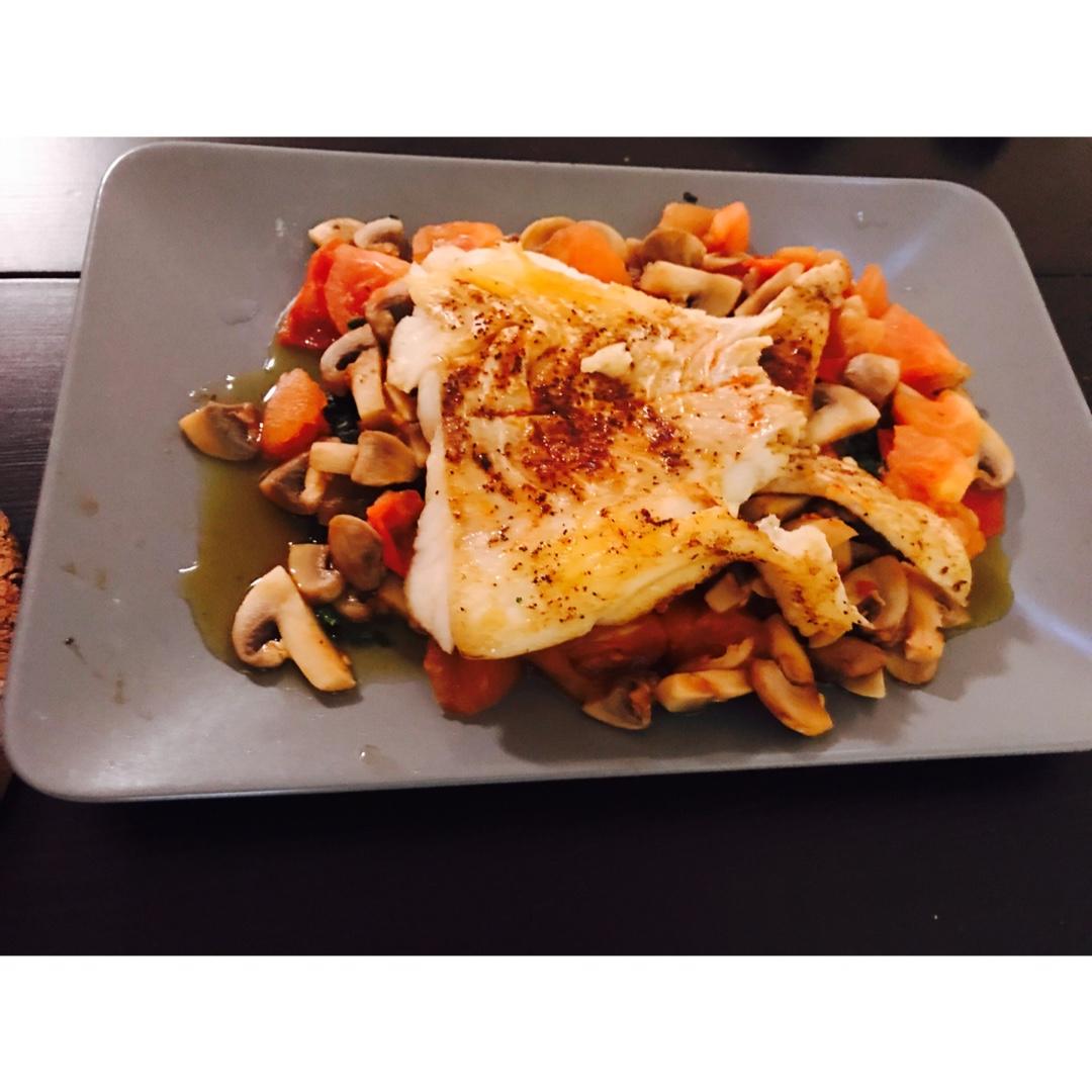 菠菜番茄香菇,煎鳕鱼。