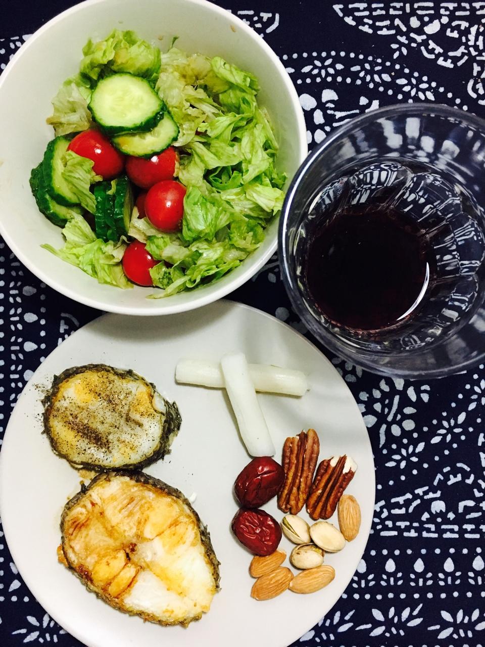 香煎银鳕鱼蛋白质优质脂肪;两根小山药碳水化合物;石榴汁蔬菜沙拉维生素