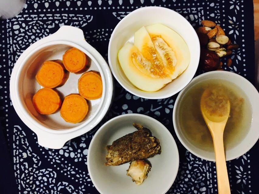 一小个红薯头碳水化合物达标,;半个小甜瓜切块维生素达标;一小块鳕鱼蛋白质达标;大枣杏仁等干果优质脂肪...