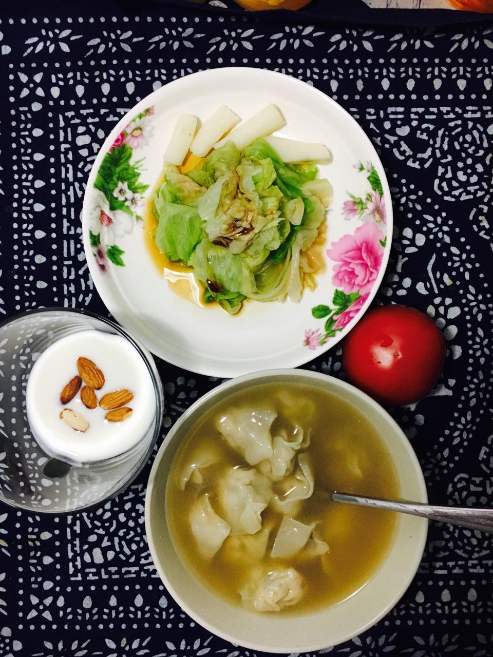 早起做水去洗漱收拾,弄完水肯定开了一分钟烫青菜,四分钟煮馄饨,煮馄饨的时候同步洗西红柿倒酸奶等。鸡肉香...