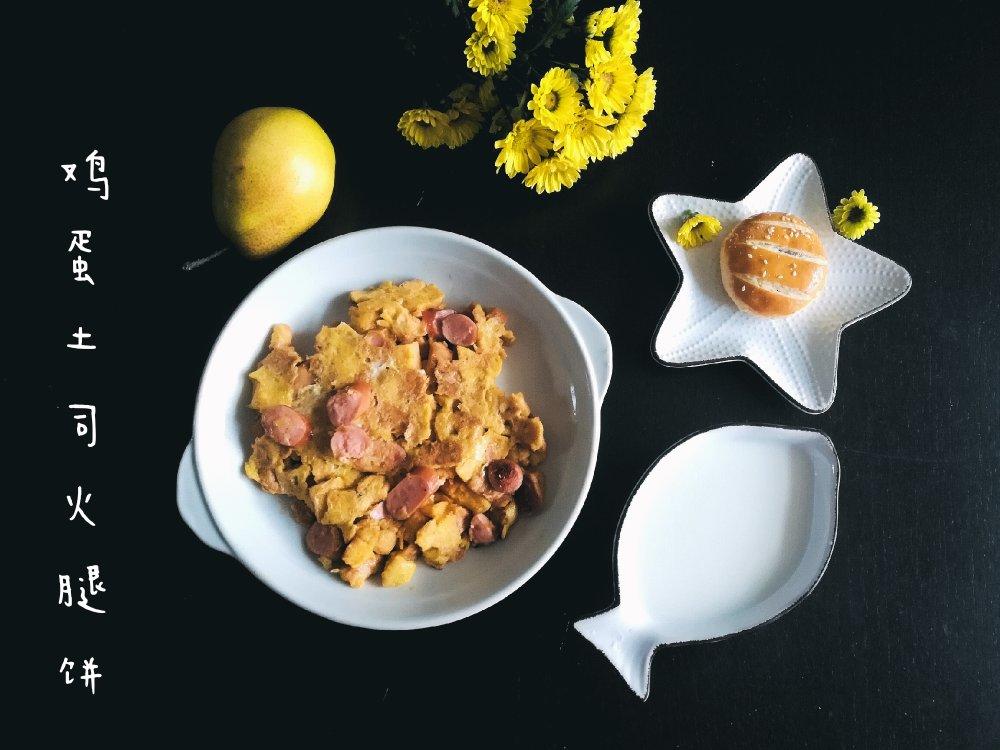 两天的土司有点干,切碎,与三个蛋液和火腿片,撒点盐,搅匀,用黄油摊至金黄。