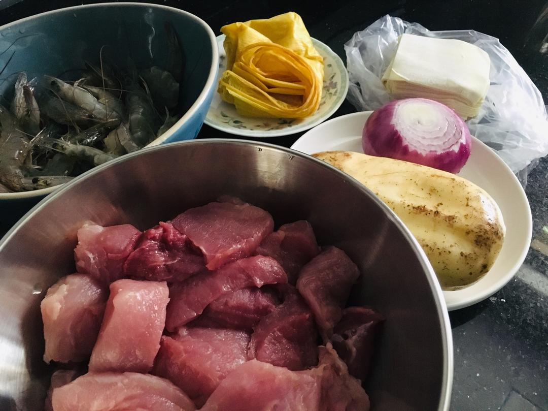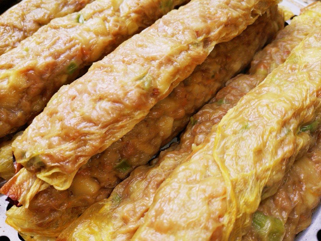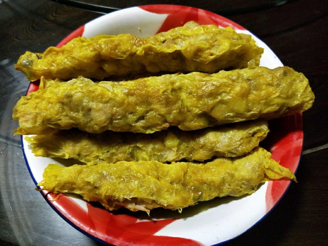 五花肉,马蹄,洋葱,胡萝卜,蒜白,红薯粉和五香粉拌匀,摊上豆皮卷起再一起下锅慢火炸至金黄,...