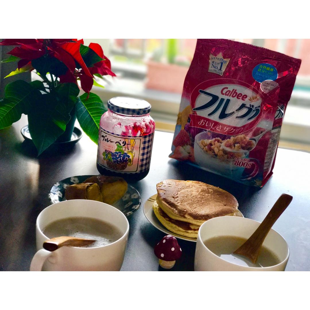 感冒,没睡好。早上随便吃点。松饼,红薯,豆浆,麦片。
