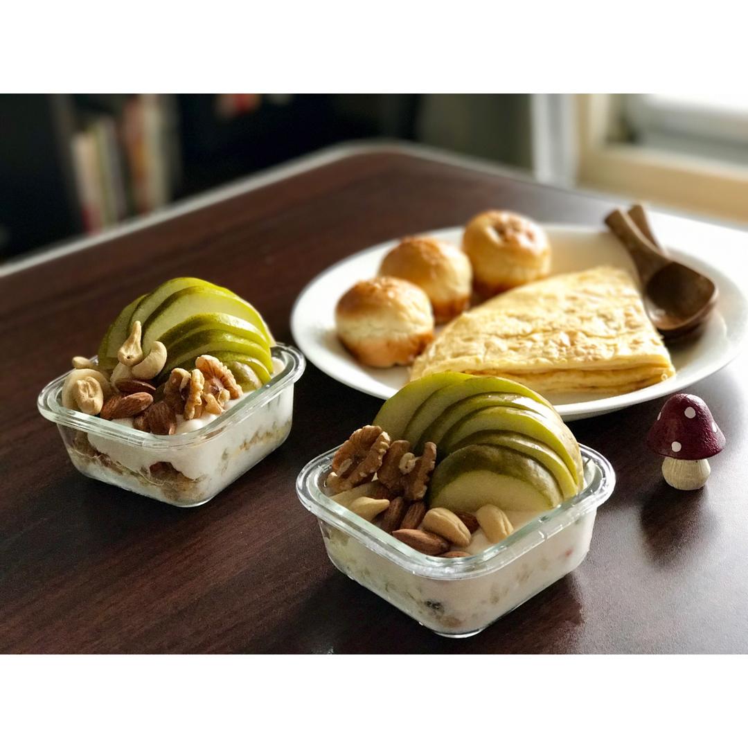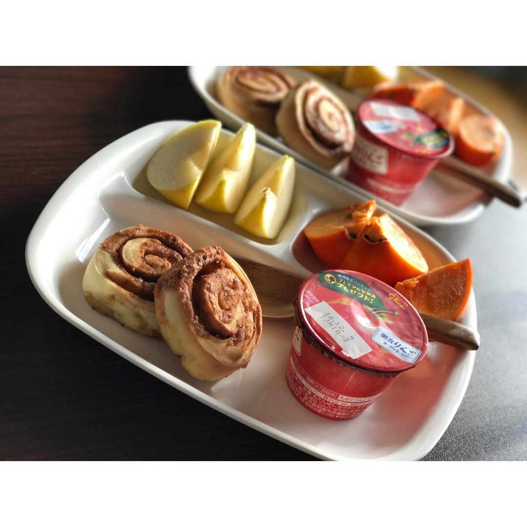 最近准备早餐以节省时间为主,肉桂卷,酸奶,梨子,柿子。