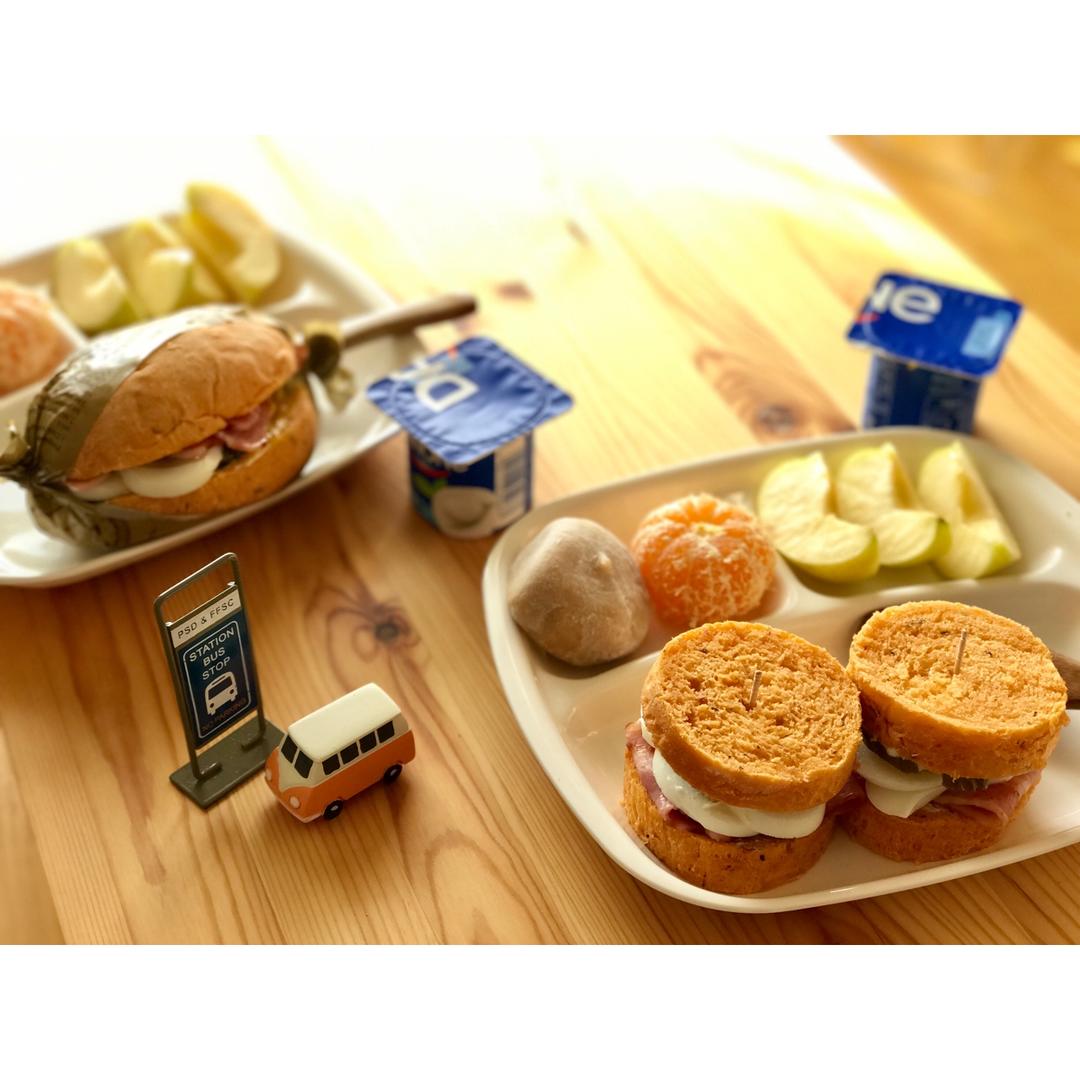 昨晚做的面包变成三明治了,夹了培根鸡蛋酸黄瓜。黄豆大福,苹果,橘子,酸奶。