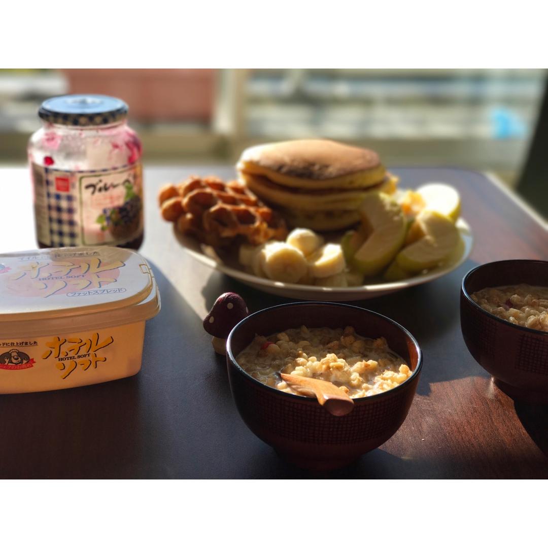 hot cake,华夫饼,水果,牛奶麦片。