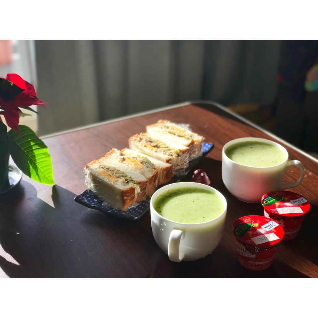 炸鱼鸡蛋牛油果三明治,葡萄雪梨猕猴桃生菜思慕雪,酸奶。雪过天晴:D
