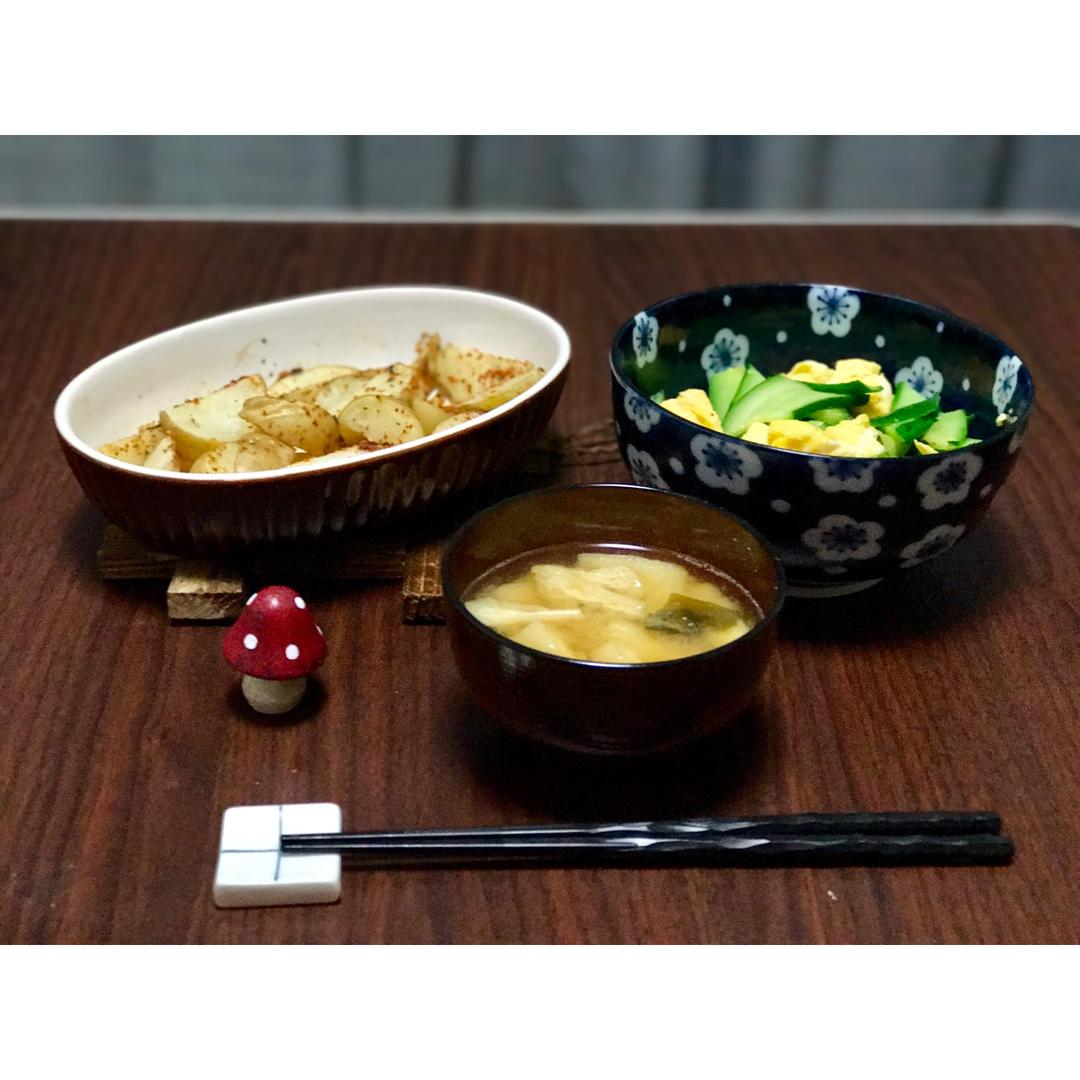 今天下午我偷吃曲奇了,所以给自己禁晚饭!老公吃着我看着!黄瓜鸡蛋、烤薯角,油豆腐味增汤。 #晚餐•2016年11月14日...