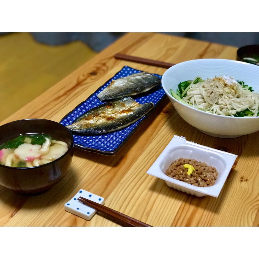 冰箱里竹荚鱼和秋刀鱼各剩了一条,就一起都烤了。除此之外就是菠菜和豆腐泡的味增汤,黄瓜拌金针菇(老公爱吃金针菇,恨不得顿顿...