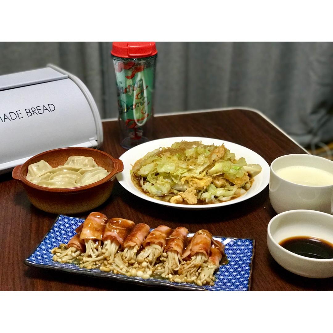 卷心菜粉丝炒鸡蛋,培根金针菇,煎饺,豆浆。