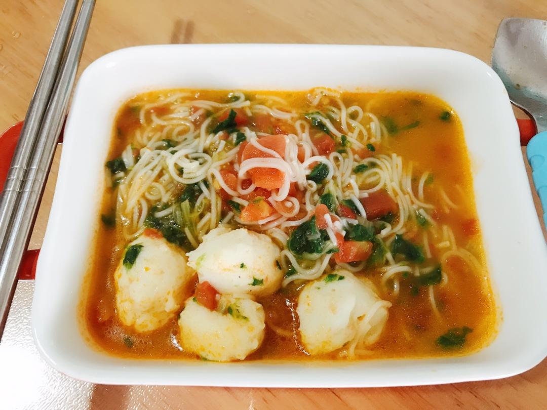 西红柿鱼丸面,鱼丸是自己做的,非常好吃,宝贝爱吃,鱼丸的营养也是非常高的🌼西红柿汤消化不好的宝宝也可以吃,很开胃促进消化