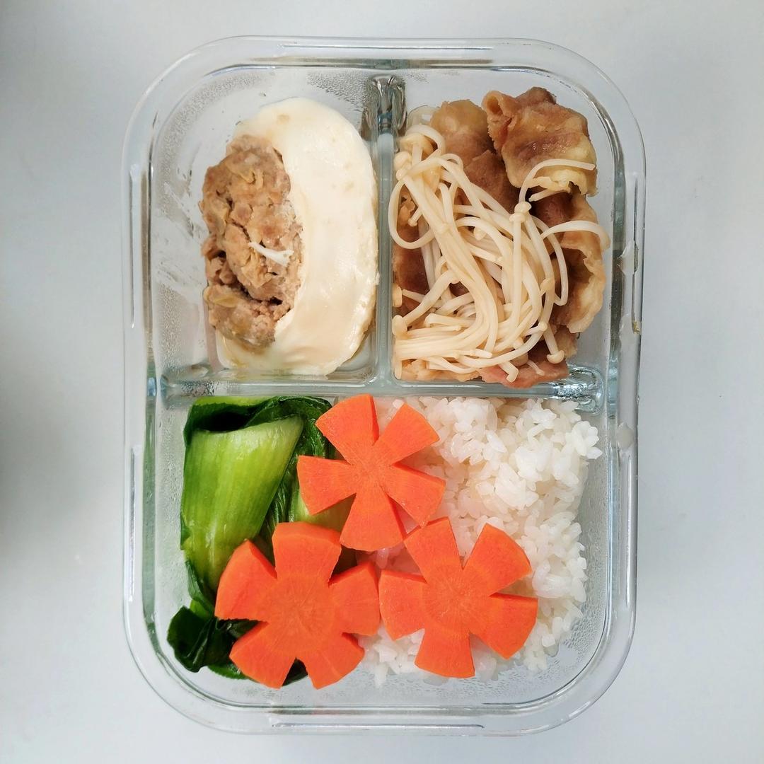 肉蒸蛋+寿喜锅味肥牛金针菇+水煮青菜+水煮胡萝卜