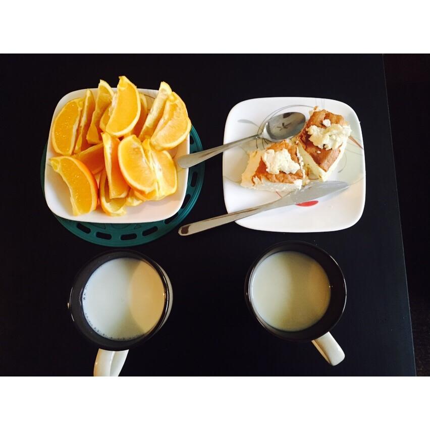 自制轻乳酪蛋糕,橙子,豆浆和牛奶