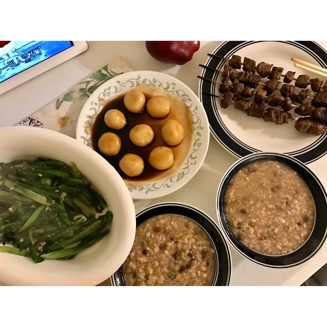 清炒油麦菜,牛肉串,八宝粥,糖不甩~