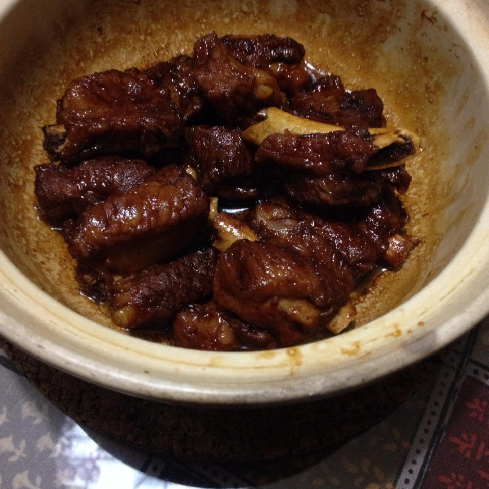 又做了一次,为上色多加了半勺老抽,其他完全和方子一样用料。排骨事先绰水过。这次收汁够,非常好吃。几乎是一抢而空。最后小朋...