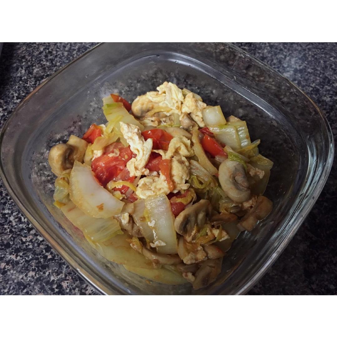 明天午餐预告~白菜蘑菇小西红柿炒鸡蛋~用椰子油炒的,炒的时候椰子油的味道好香~期待明天的味道呀呀呀!本来没打算做饭,因为...