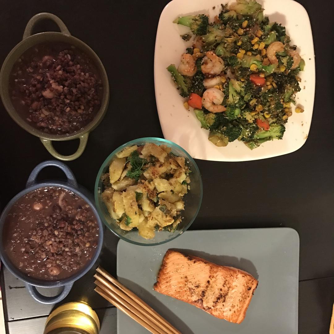 三文鱼 孜然土豆 西兰花虾仁。