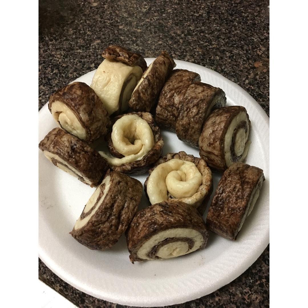 做失败了,我知道很丑……这次的粉不行,怎么揉都很干,睡不够。家里没有红曲粉,我就想用可可粉,更不吸收了。。。就变成这样子...
