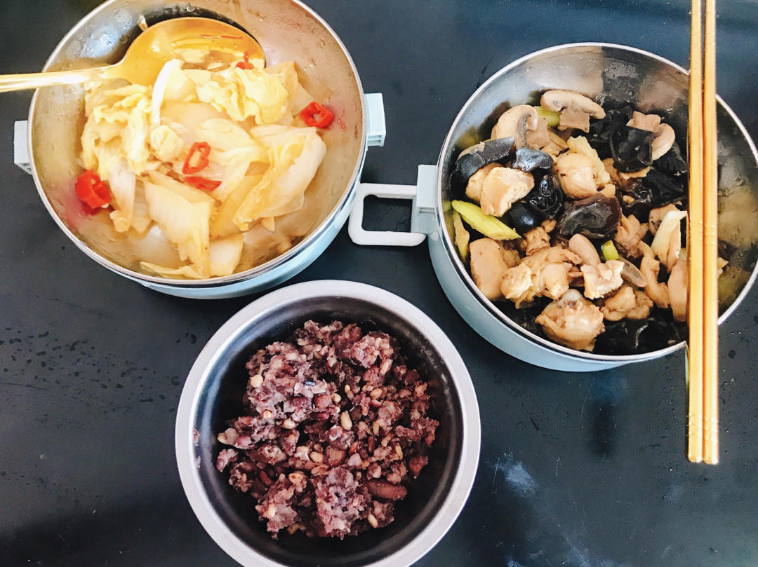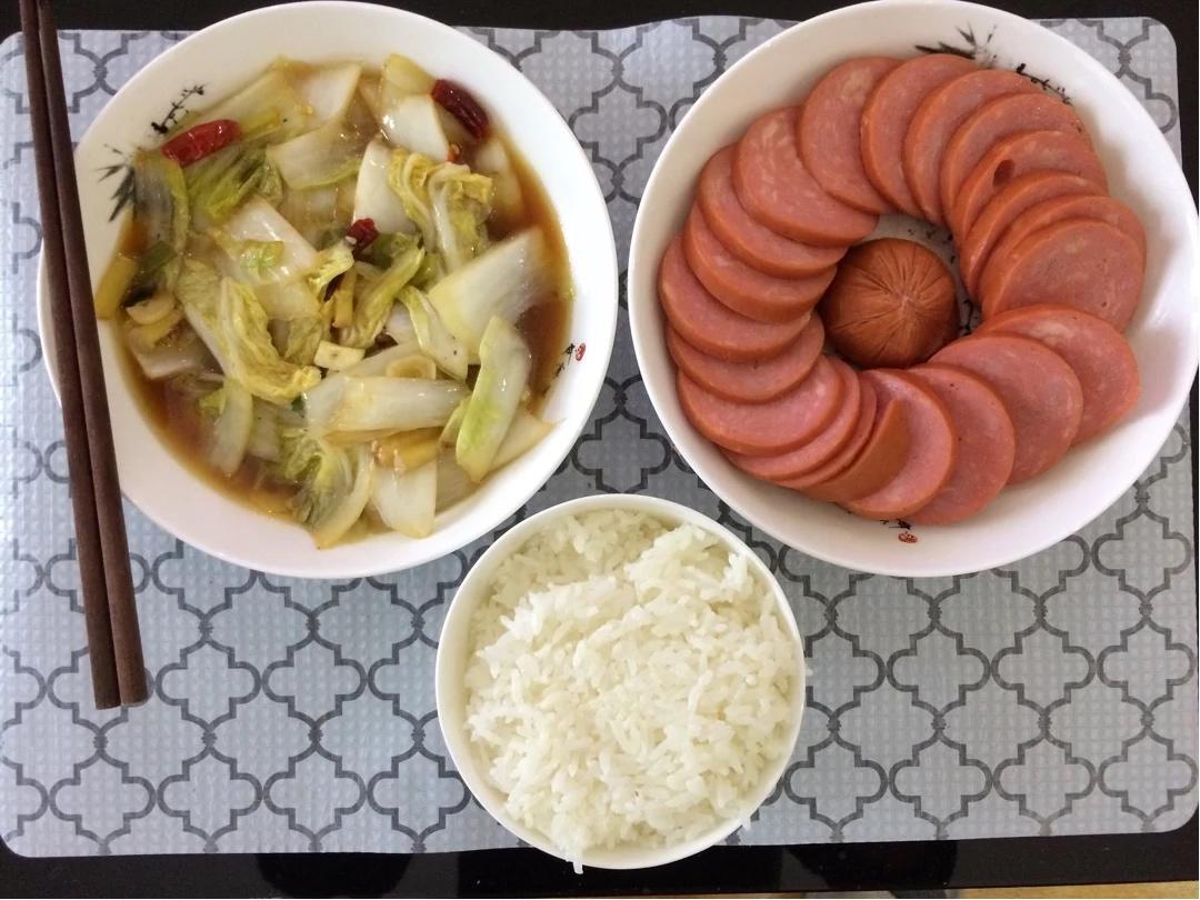 醋溜白菜+菠菜炒鸡蛋+二米饭
