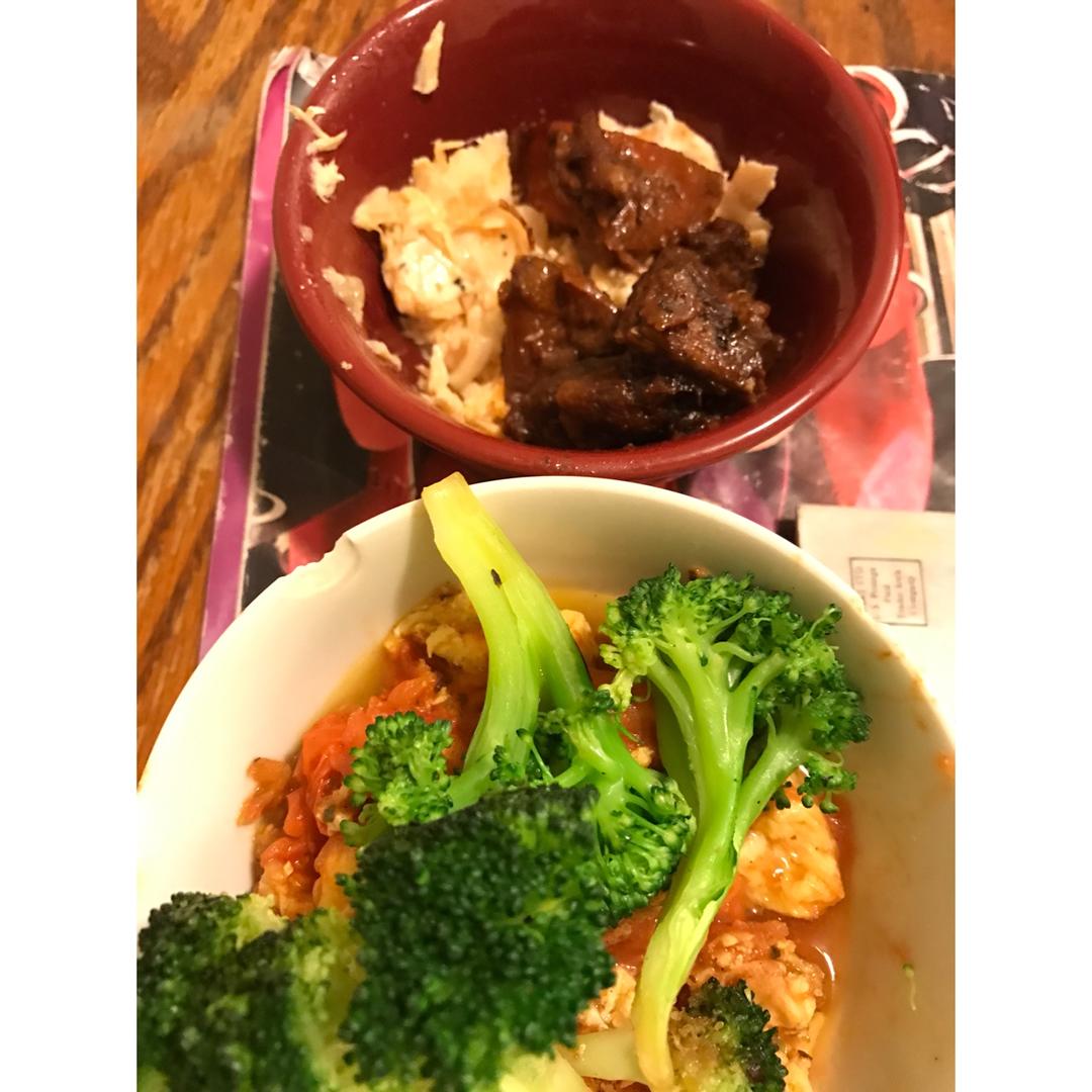 番茄炒鸡蛋,蒜蓉西兰花,酱烧排骨,慢烤三文鱼