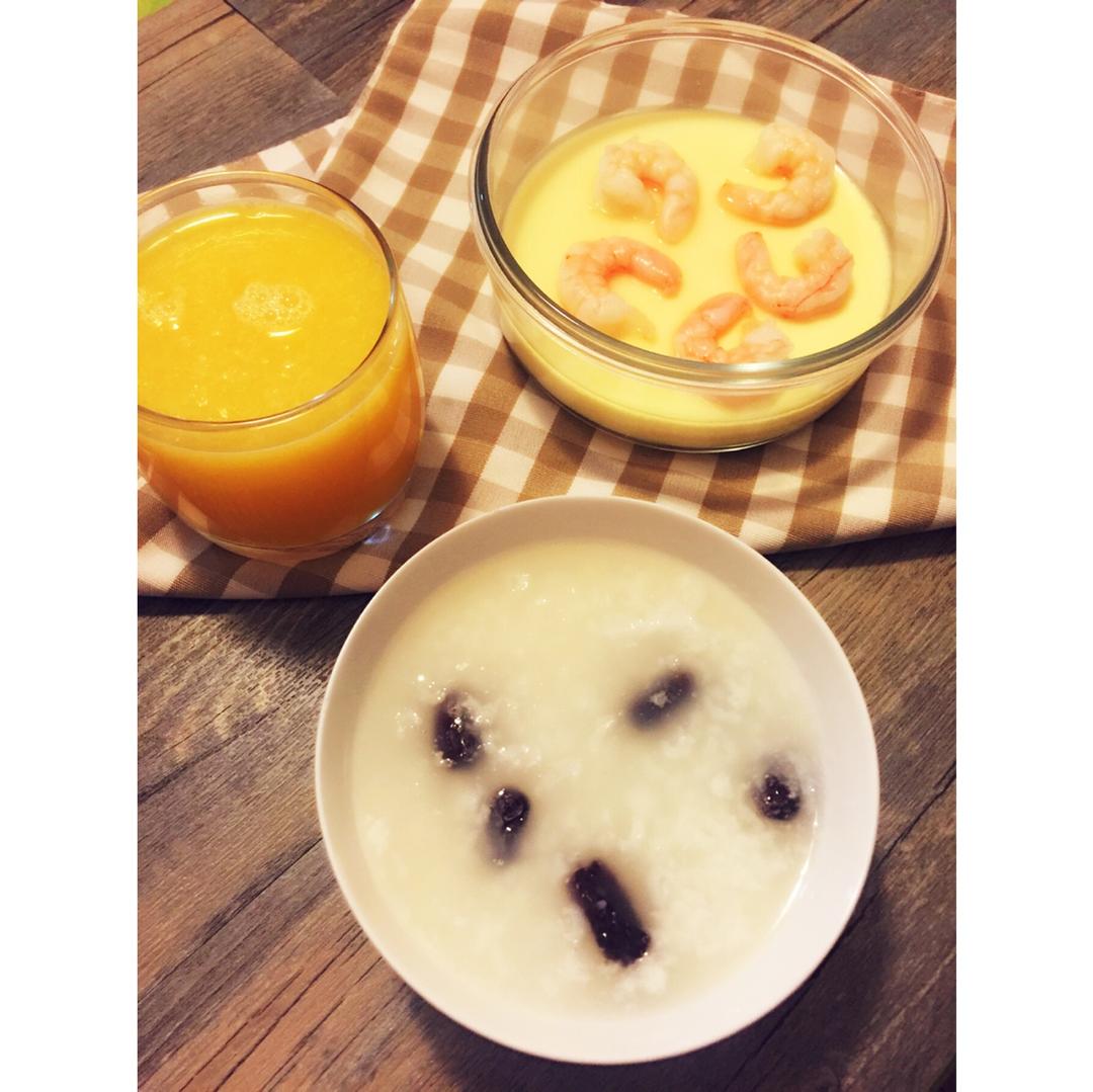 大枣粥、虾仁鸡蛋糕和鲜榨橙汁。