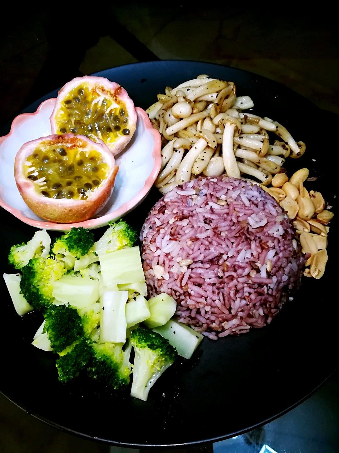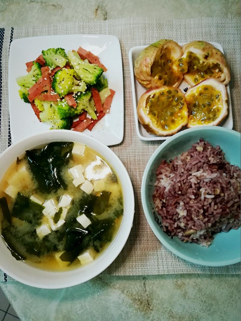 簡單的素晚餐~素火腿花椰菜、豆腐味噌湯、百香果果、十谷米飯