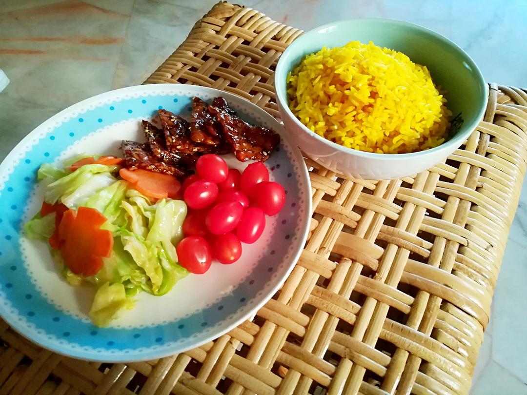 黃薑飯、炒圓包菜、甜辣天貝和小番茄