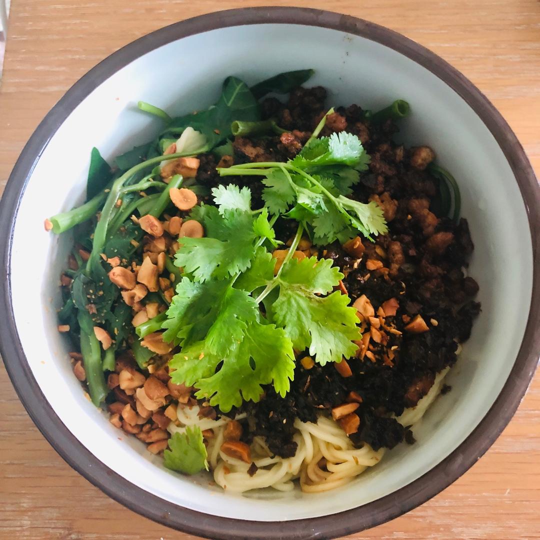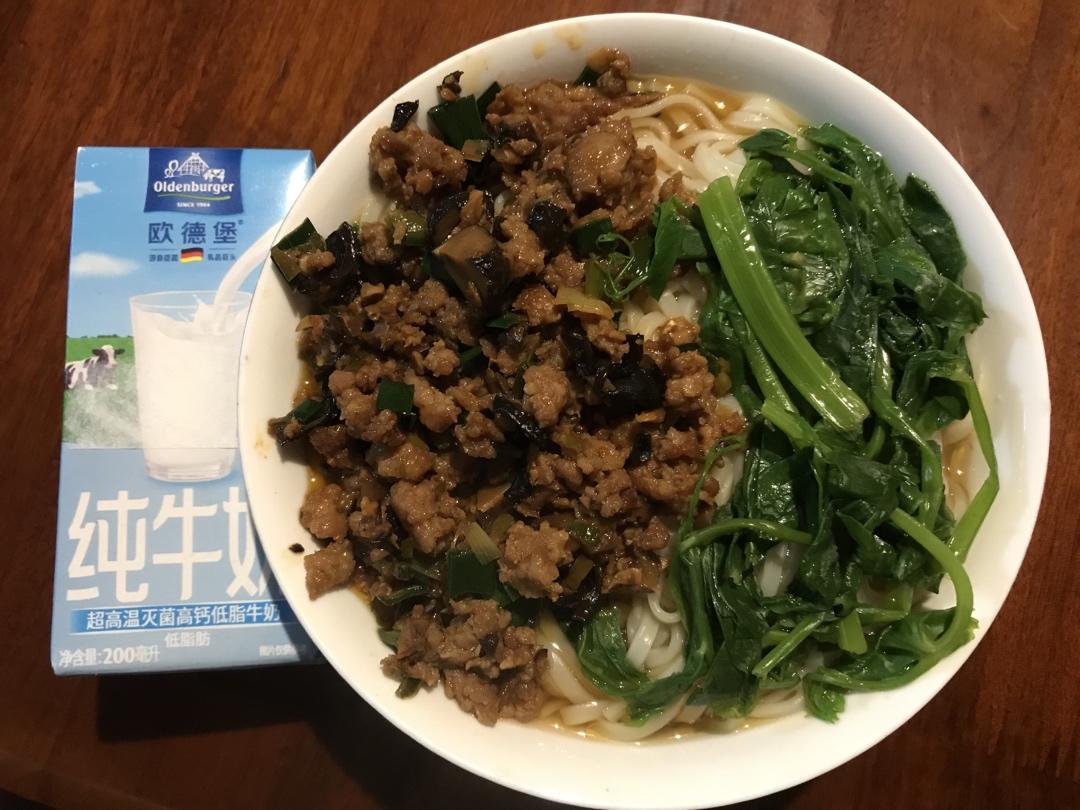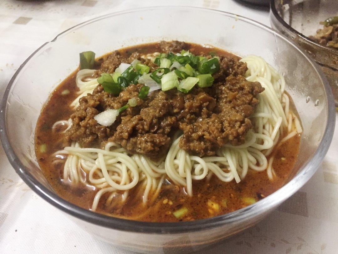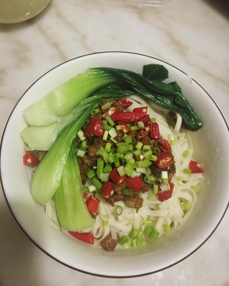 用做酱肉包剩下的肉沫炒的杂酱,老年人的杂酱面,几乎没有辣椒油,这算是清汤吧