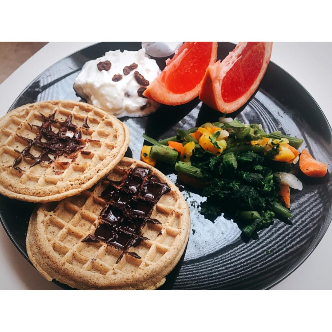 非常懒的一顿: 速冻全麦waffle,黑巧克力,还有速冻蔬菜,堆盘子里进微波炉。挖一大勺vanilla greek yo...