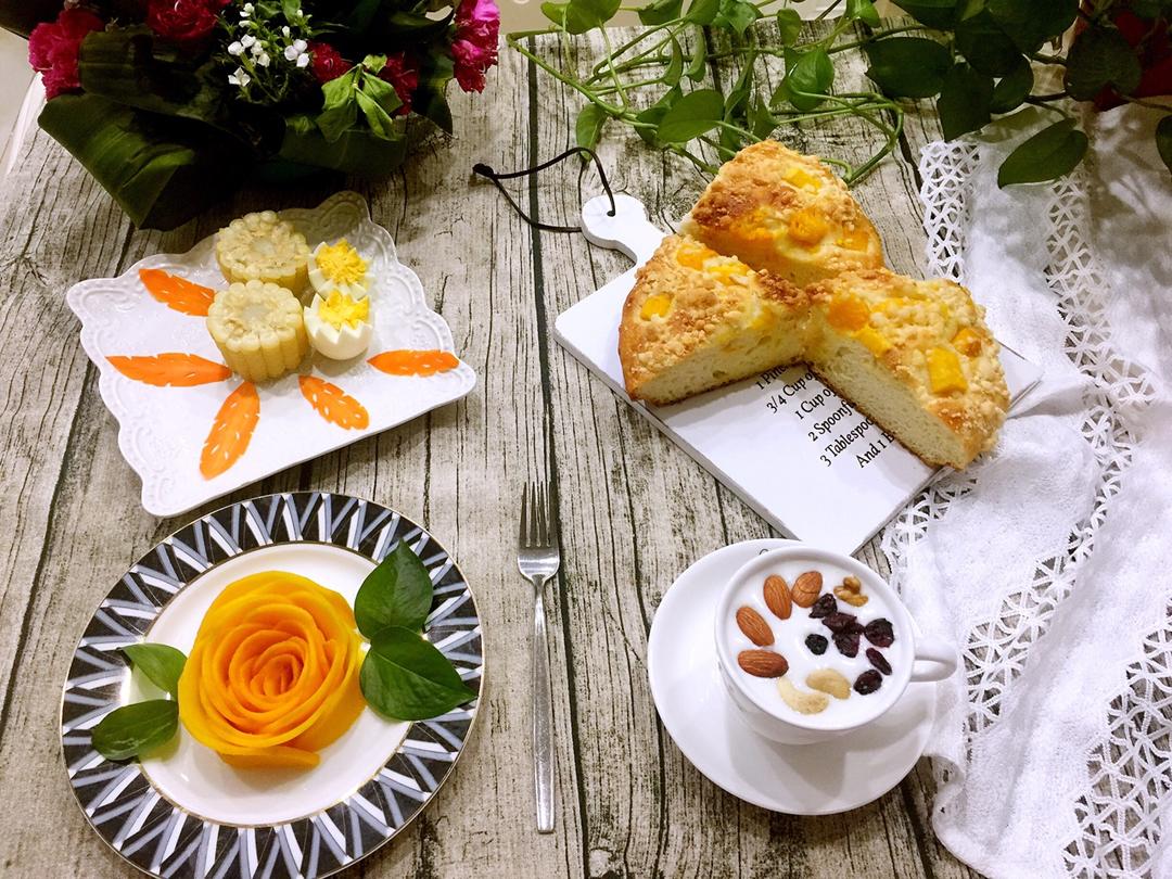芒果酥粒面包,煮蛋,玉米,