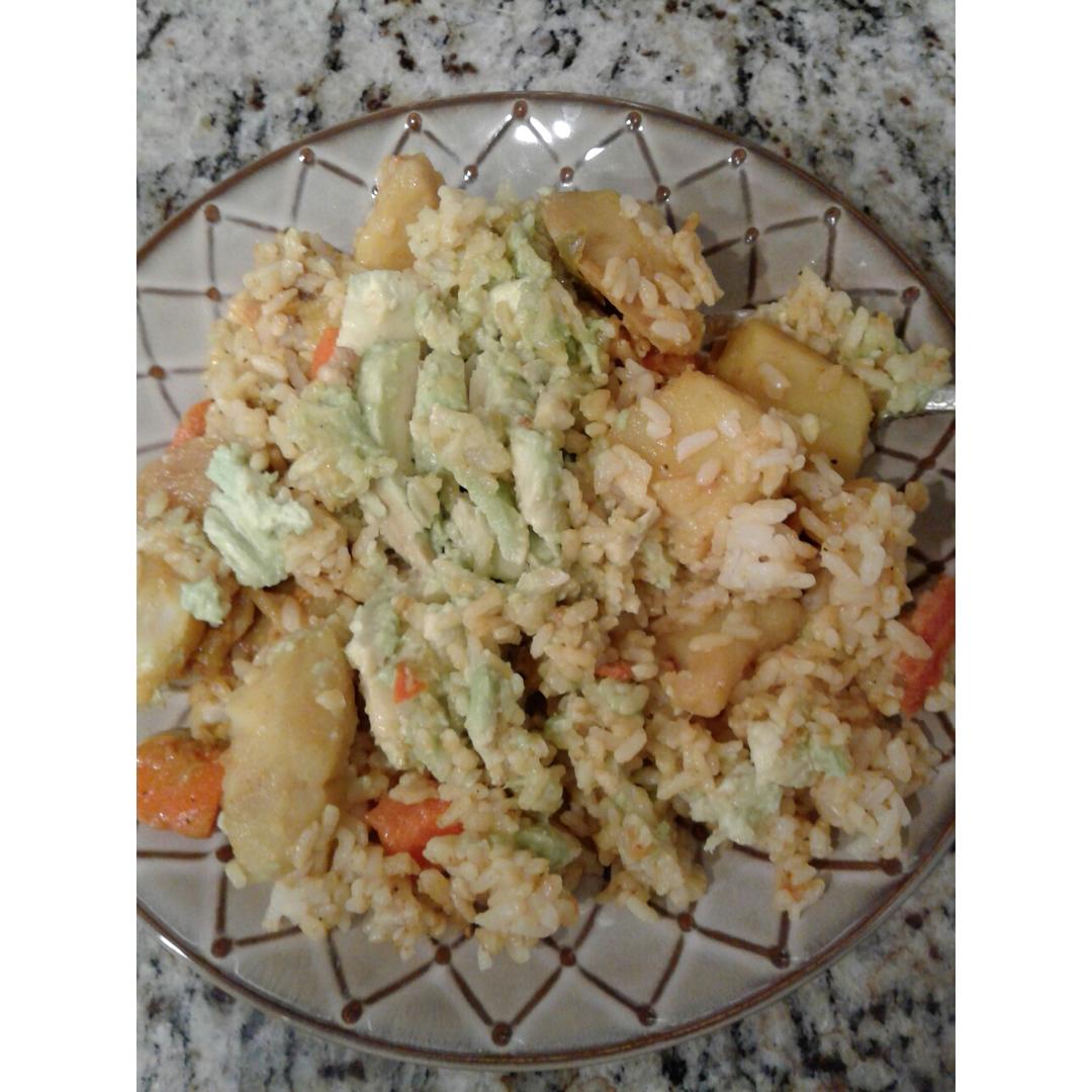 咖喱土豆牛油果拌饭 昨晚做的咖喱土豆加热 拌入半个牛油果 好吃