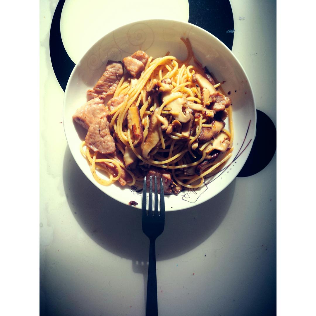 肉片+香菇+黑椒汁+意面,说起来自己是在做意大利炒面吧( •̀∀•́ )