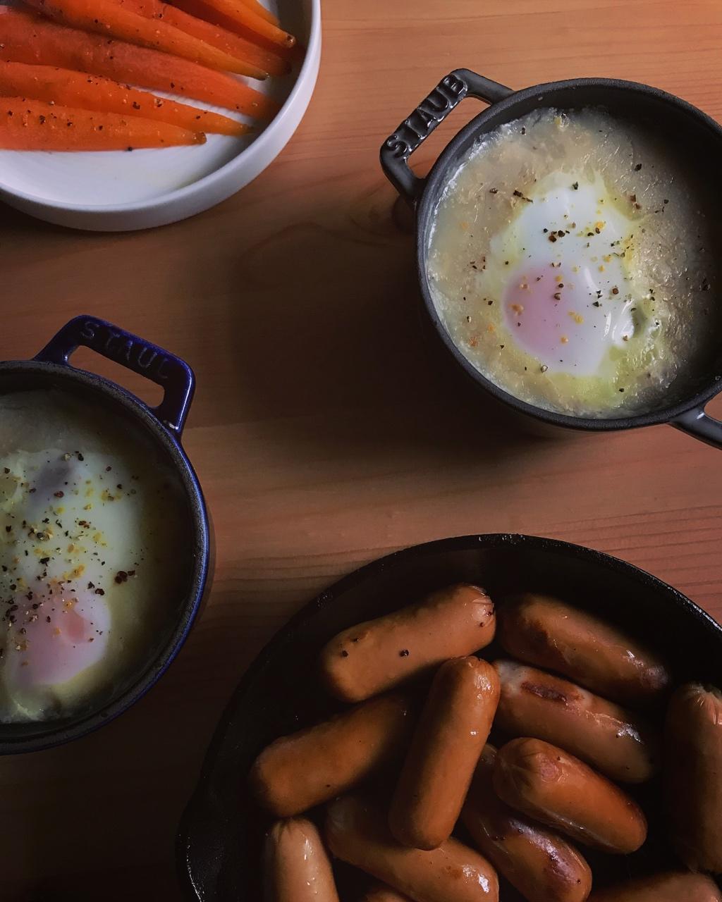 窝蛋肉丸麦片粥、芝士肠仔、香煎胡萝卜仔