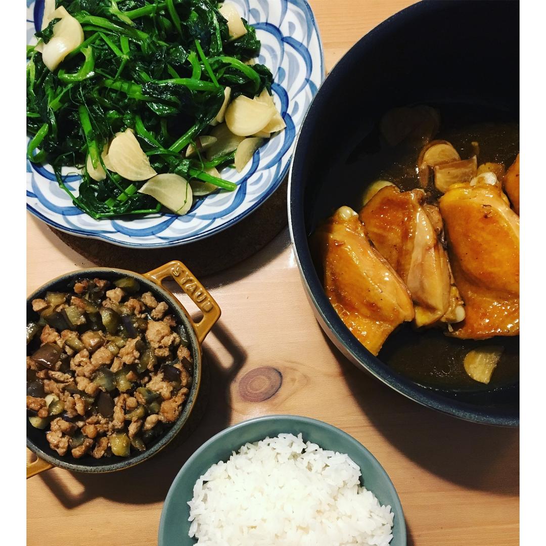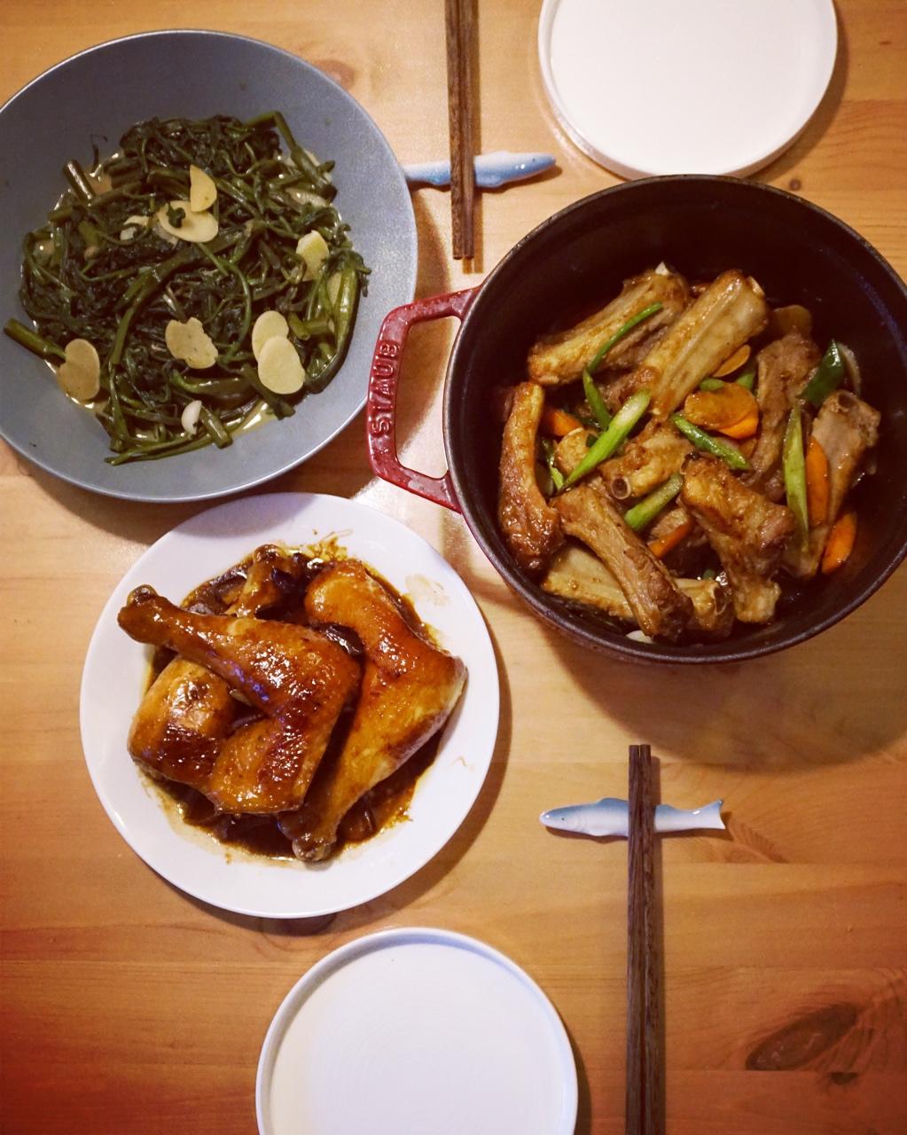 鼓油鸡腿,芦笋胡萝卜焖排骨,蒜片炒通菜